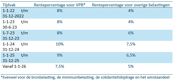 Dit betekent dat voor de vennootschapsbelasting hetzelfde rentepercentage moet worden toegepast als voor andere belastingmiddelen. De percentages voor zowel de vennootschapsbelasting als voor de andere belastingmiddelen zijn in de afgelopen jaren regelmatig gewijzigd. Hieronder wordt schematisch weergegeven welke belastingrentepercentages in de jaren sinds 2022 van toepassing waren.